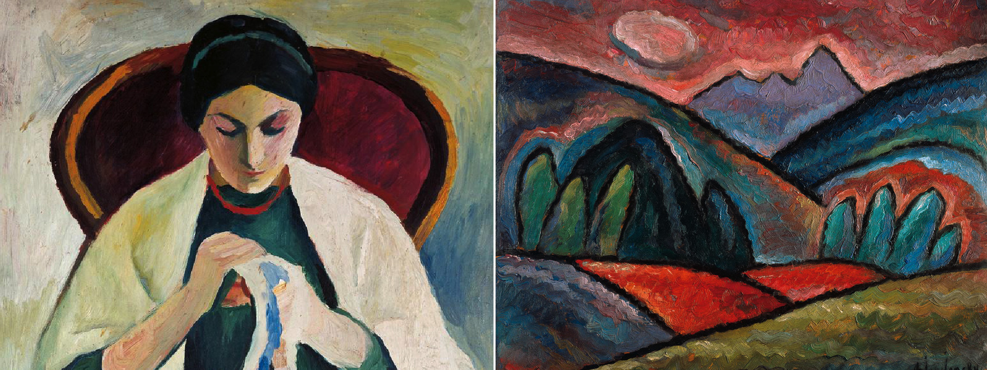 August Macke: Stickende Frau im Sessel, 1909/10, Öl auf Holz, 57,8 x 47,2 cm, Ausschnitt, Bildrechte: Stiftung Sammlung Ziegler im Kunstmuseum Mülheim an der Ruhr, Foto: Wolfgang Morell, Bonn