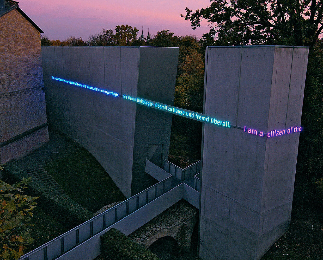 Diese Installation von Marie-Jo Lafontaine ist ein Gemeinschaftsprojekt vom Museums- und Kunstverein Osnabrück e.V. und dem Felix-Nussbaum-Haus anlässlich des 125-jährigen Geburtstages des Vereins und des 100. Geburtstages von Felix Nussbaum. Die Neontextzeile »Ich bin ein Weltbürger, überall zu Hause und fremd überall« ist von Weitem lesbar und tritt in den Sprachen Deutsch, Englisch und Spanisch in Erscheinung. Sie umläuft und verbindet zwei Gebäudeteile des Felix-Nussbaum-Hauses: den Nussbaum-Gang und das Vertikale Museum.