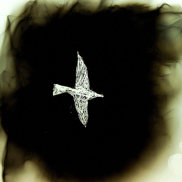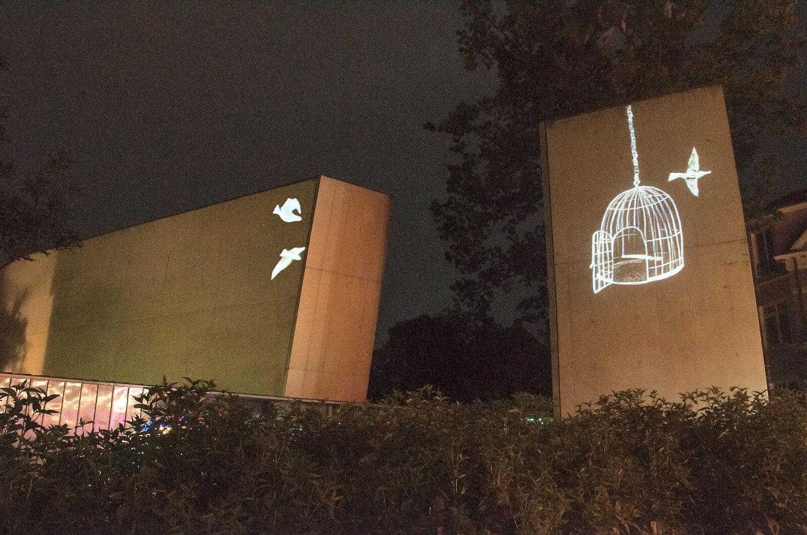 Haus in den kommenden Wintermonaten. Bei Einbruch der Dunkelheit erscheint auf der Außenwand des turmartigen Gebäudeteils des Felix-Nussbaum-Hauses die projizierte Zeichnung eines Vogelkäfigs. Ein ebenfalls in weißen Linien gezeichneter Vogel fliegt über die anderen Außenwände des Museumskomplexes hin zum Käfig. Andere Vögel kommen dazu und fliegen weiter. Sie scheinen das ganze Gebäude zu umfliegen, zu durchfliegen, zu überfliegen.