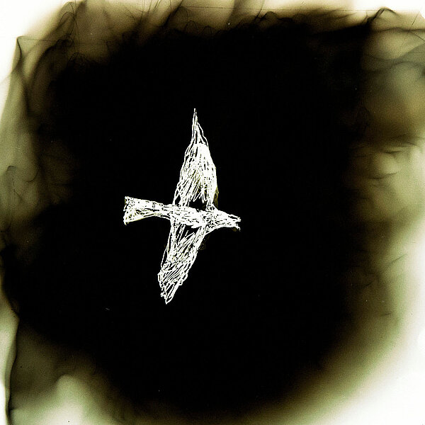 linke Seite: Nikola Dicke, Vier Vögel, Ruß auf Glas, 27 x 48 cm, 2012 rechte Seite: Nikola Dicke, Aus dem Käfig, Ruß auf Glas,